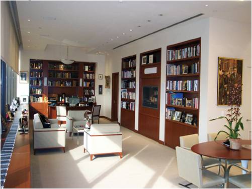 View of custom cherry wood media wall, sitting area and private conference.